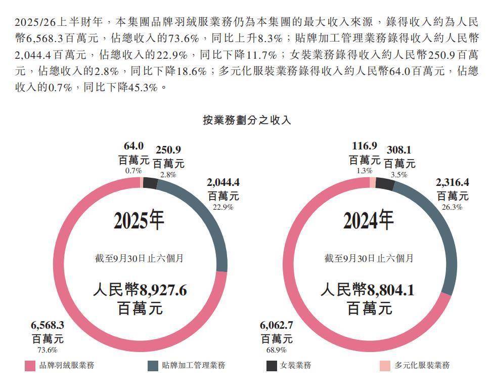 具体来看,在业务分部方面,品牌羽绒服业务收入约为65.68亿元,占总收入的73.6%,同比上升8.3%。贴牌加工管理业务收入约为20.44亿元,占总收入的22.9%,同比下降11.7%。女装业务收入约为2.51亿元,占总收入的2.8%,同比下降18.6%。多元化服装业务收入约为6400万元,占总收入的0.7%,同比下降45.3%。