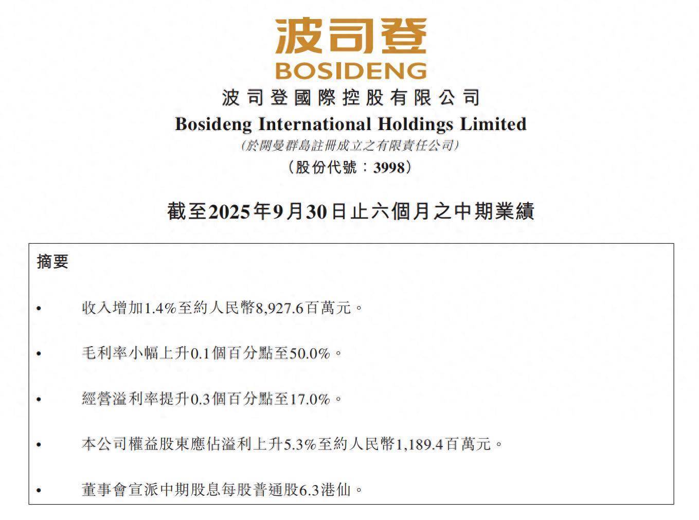 来源为波司登本次发布的中期业绩报告公告显示,截至2025年9月30日,波司登实现营收约89.28亿元人民币(下同),同比上涨1.4%;归母净利润11.89亿元,同比增长5.28%;公司中期业绩连续8年创同期历史新高。毛利率小幅上升0.1个百分点至50%,经营溢利率提升0.3个百分点至17%。公司基本每股收益为0.1035元,平均净资产收益率为7.26%。同时董事会公布的2025-2026年中期分配预案为“每股派息0.063港元”。